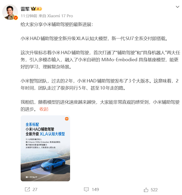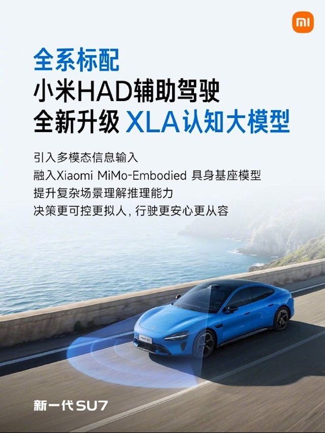 今日,雷军在微博上分享了小米辅助驾驶的最新进展。他表示,小米HAD辅助驾驶全新升级XLA认知大模型,新一代SU7全系交付即搭载。